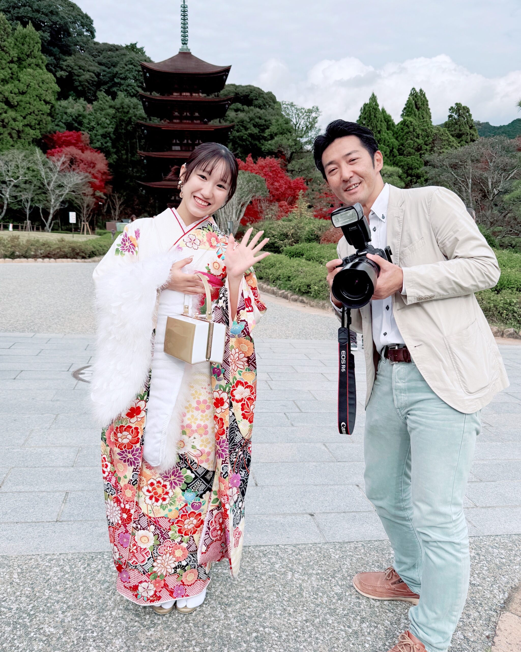 二十歳の記念撮影を瑠璃光寺五重塔で