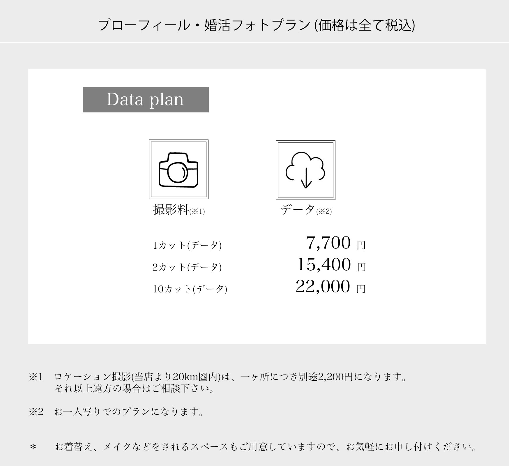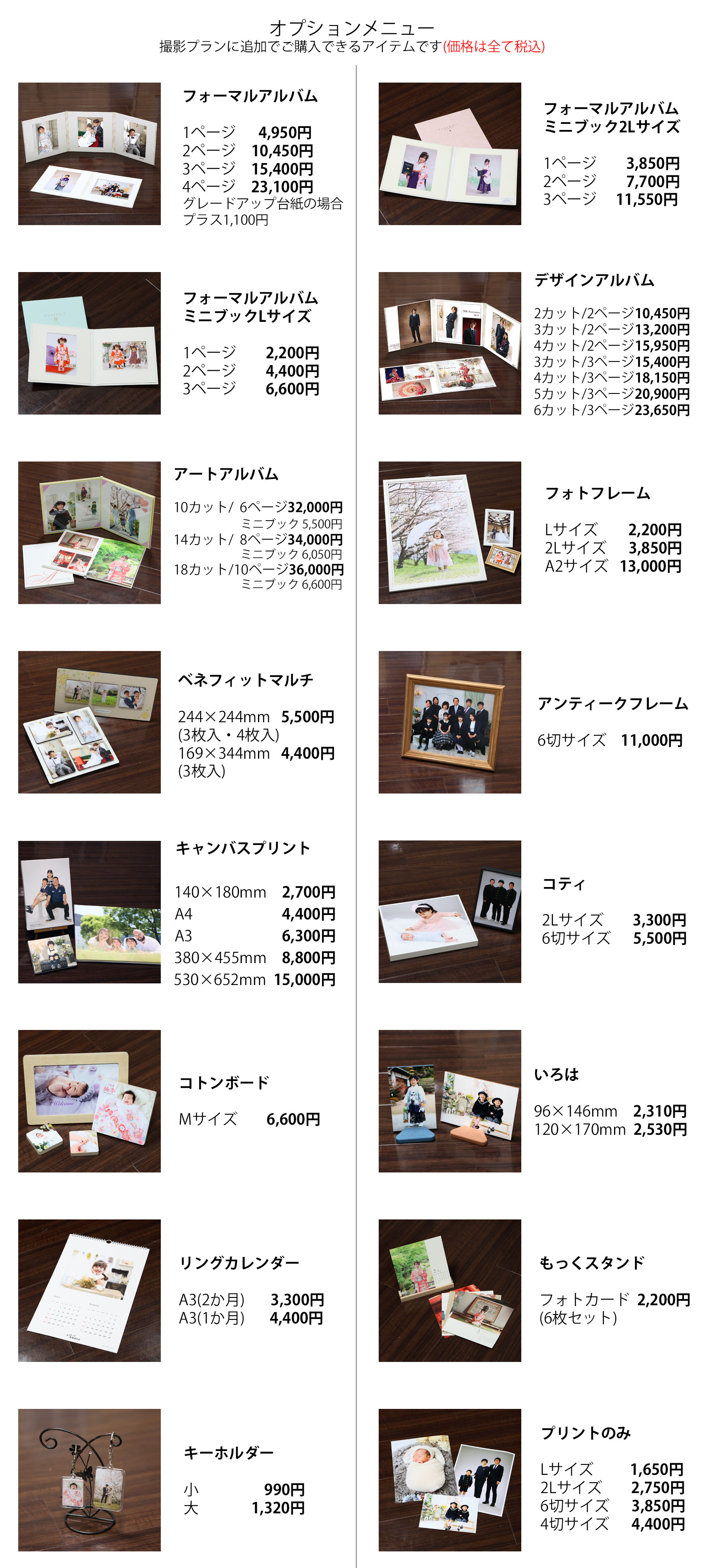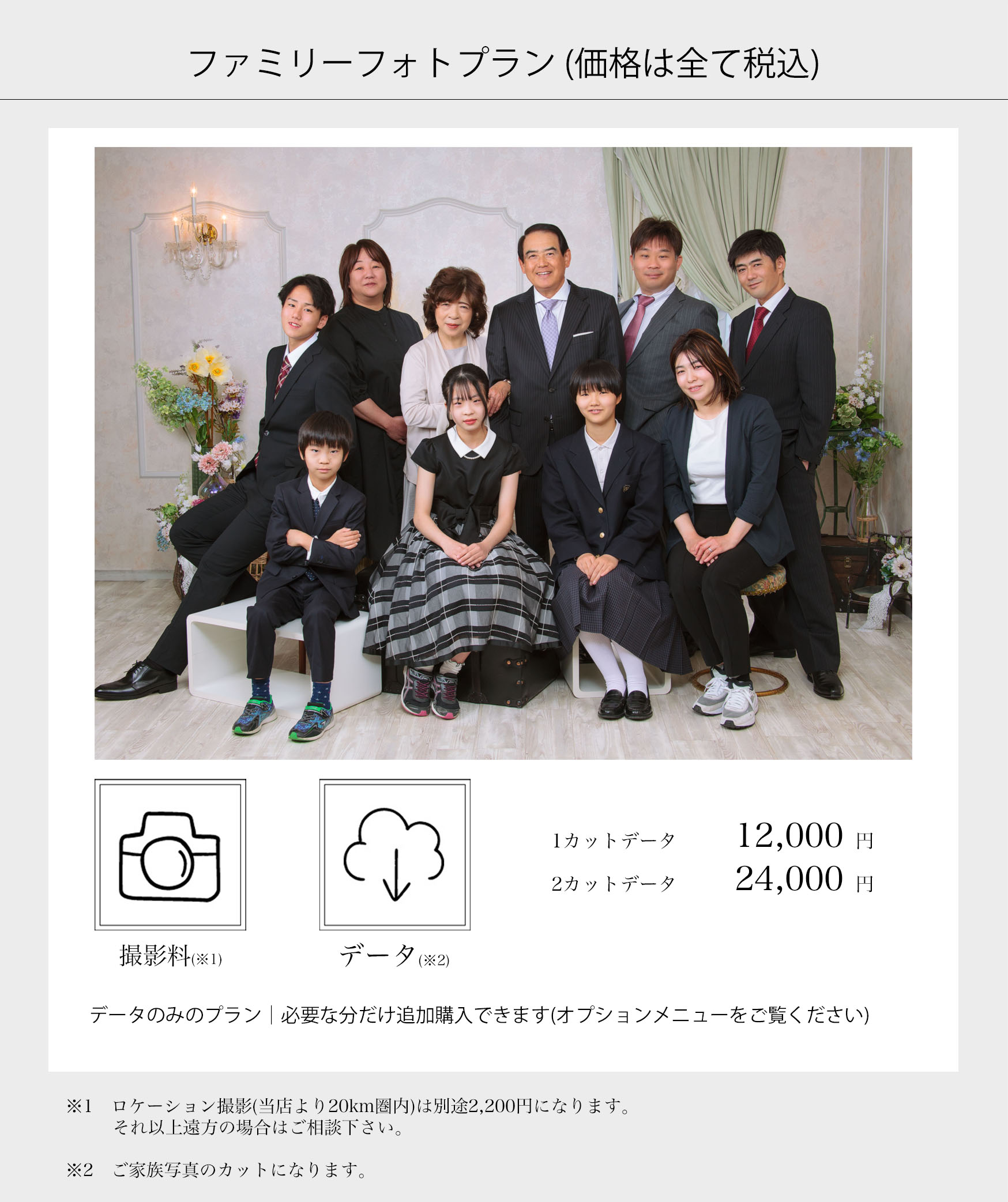 ファミリーフォト・終活フォト・思い出写真・プロフィール・婚活フォト・データについて・オプションメニュー